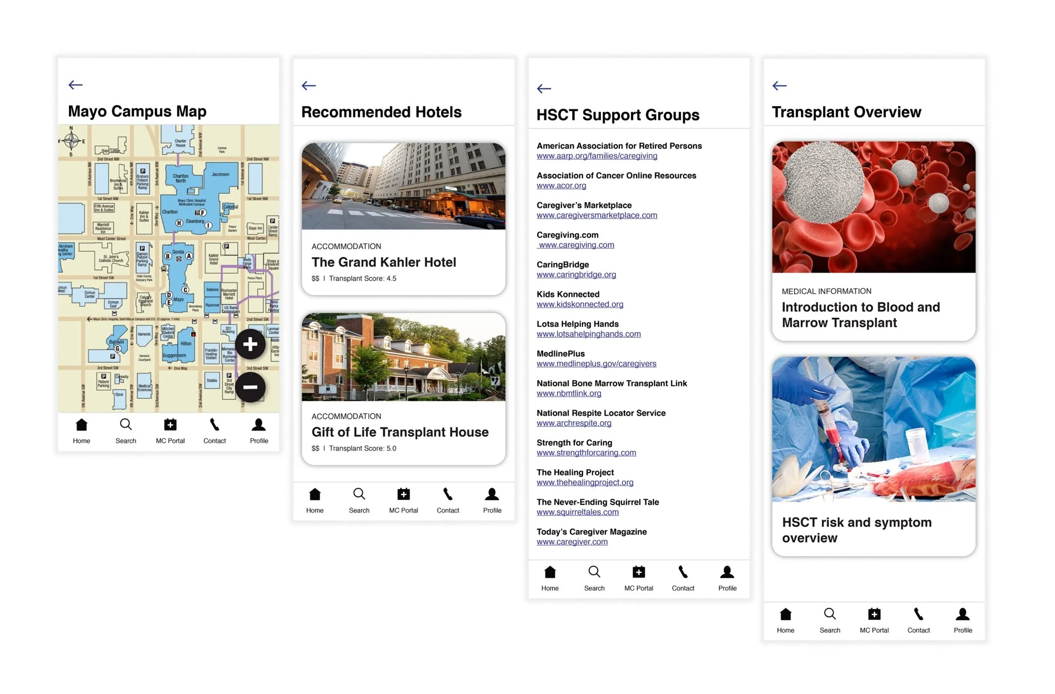 Although a user profile has not been developed at this time, the real application will allow the user to enter information, such as the Mayo Location, the type of cancer being treated, and other needs. This will avoid presenting content that is not relevant to the user’s context.