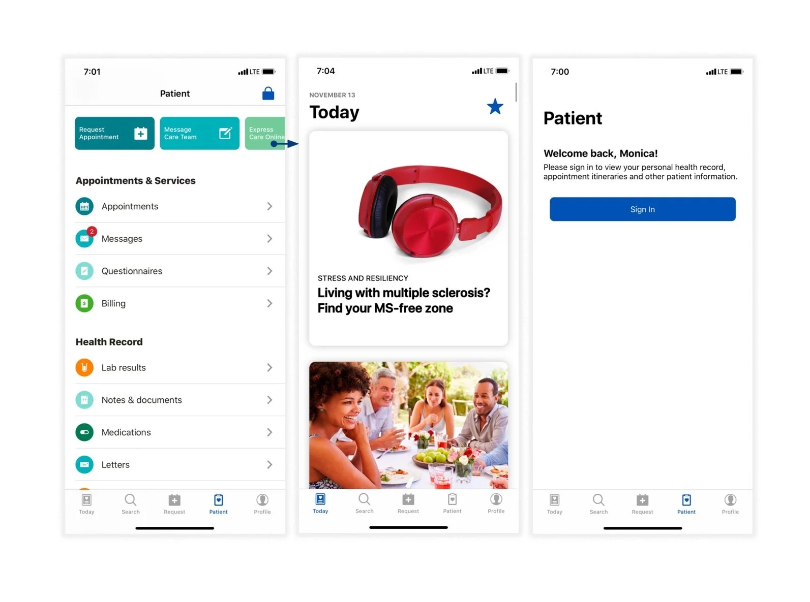The visual design chosen for the application follows the Mayo Clinic Design System, which is the same as what patients see on the Mayo Clinic mobile portal. We believe that keeping the experience consistent across the Mayo Clinic is important for user trust and orientation, especially when users of this application are, on average, over 60 years old.
