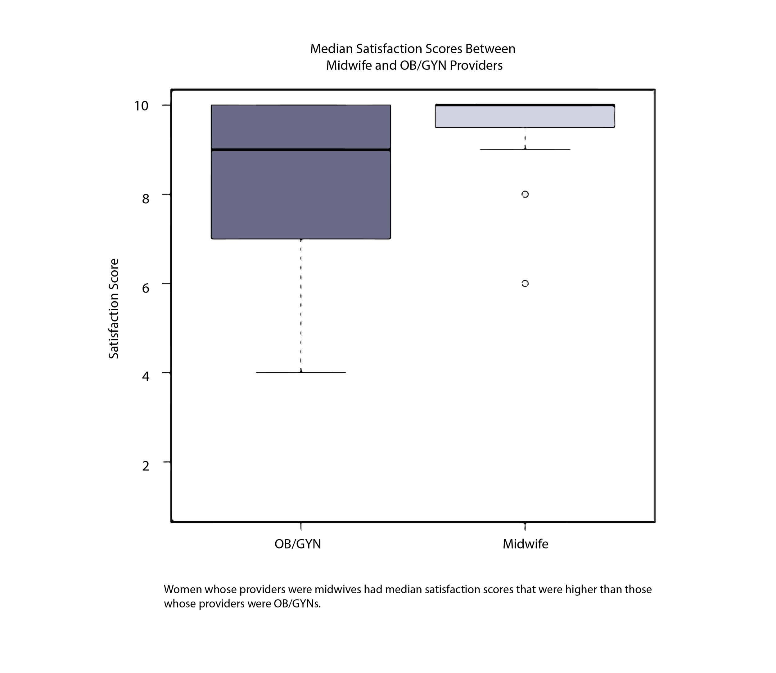 Spearman Rank Correlation tested the correlation between the number of medical interventions in each childbirth and satisfaction outcomes, and Wilcoxon Rank Sum tests compared the satisfaction outcomes between the groups of women who had a doula present at their birth and those who did not, women who had a midwife and women who had an obstetrician/gynecologist as their primary providers, and between women who had birth plans that were followed and women who did not.