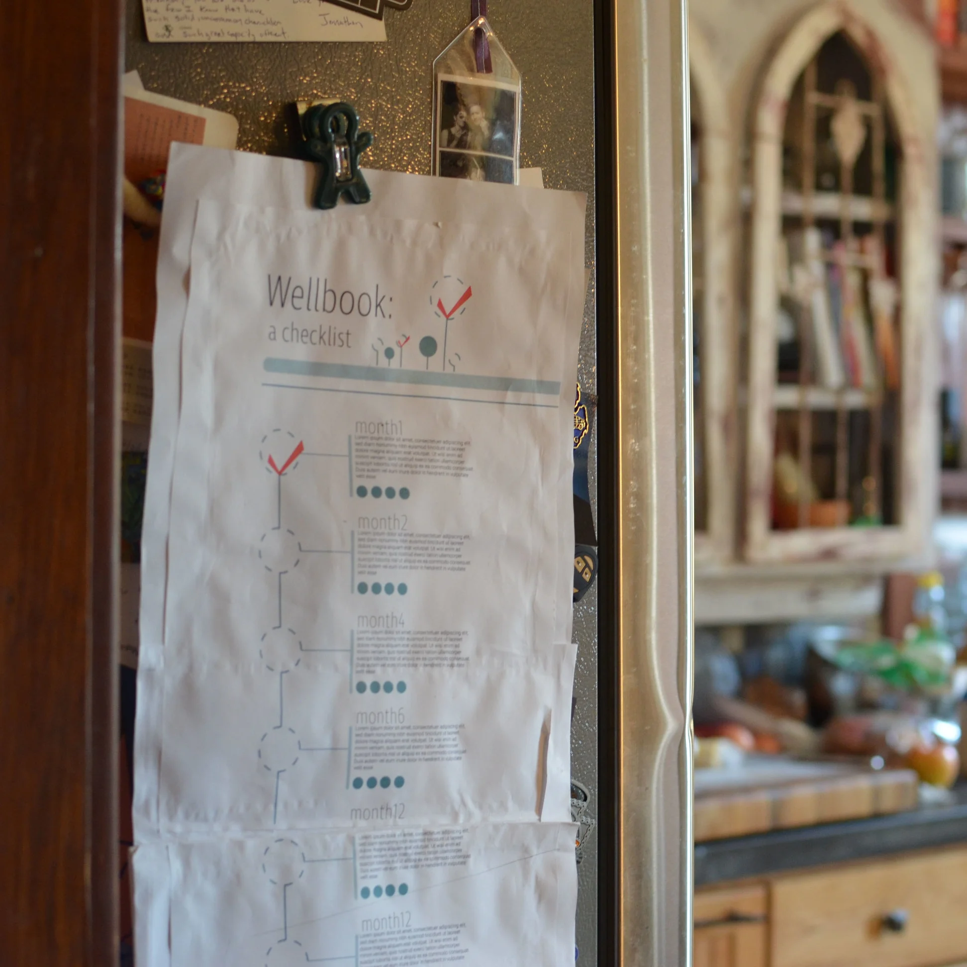 We traded the baby book for a simplified envelope with the well-baby checklist on it made out of plastic and magnets to stick to the fridge. This option was intended to serve as a constant reminder for the parents as well as a place to keep the child's health information.